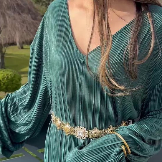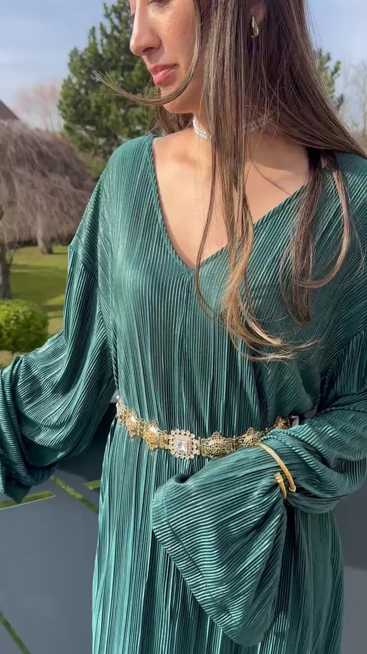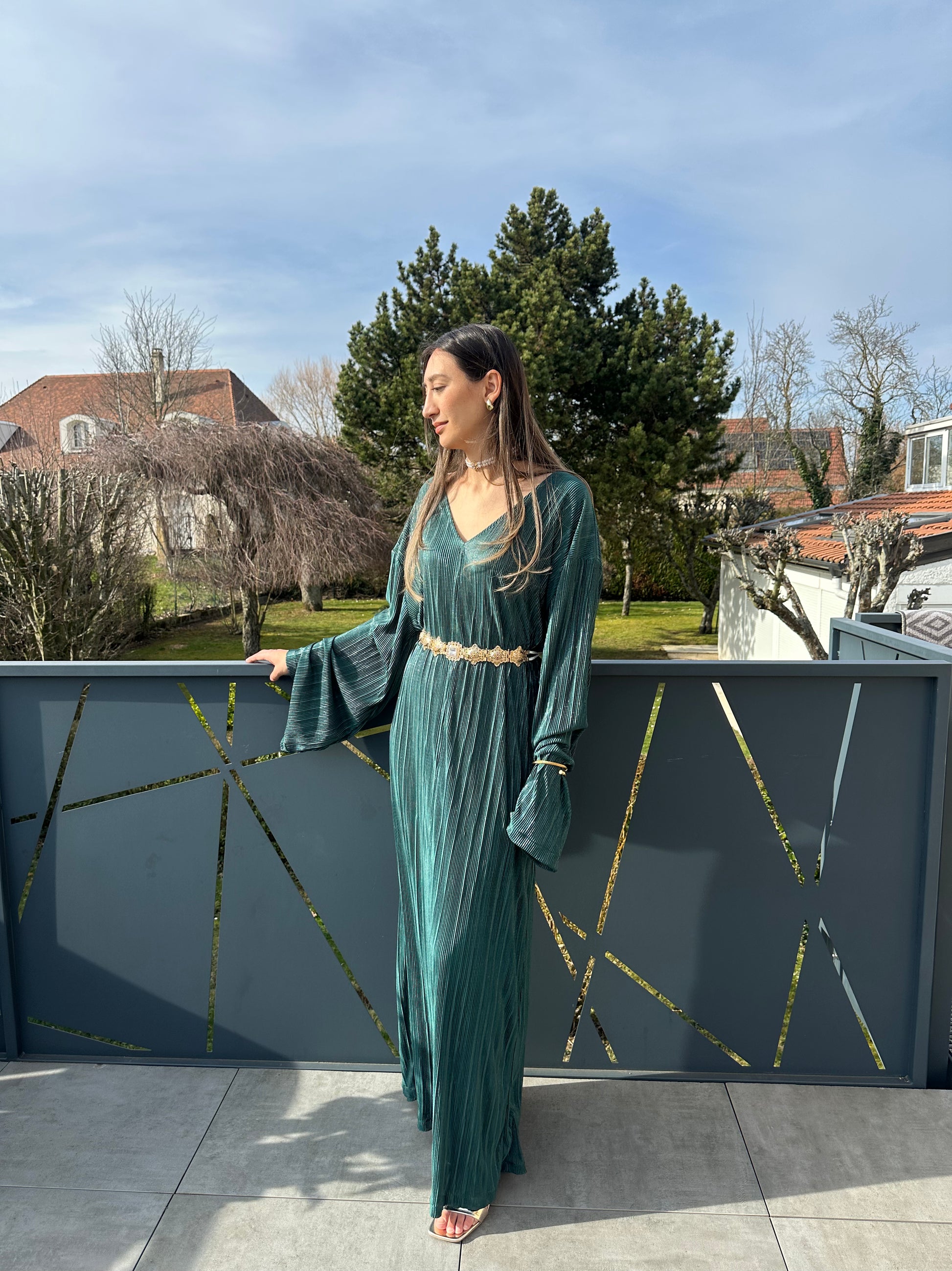 Sublimez vos moments spéciaux avec cette abaya verte fluide, délicatement ornée de paillettes. Une pièce chic et élégante, parfaite pour un look raffiné.
