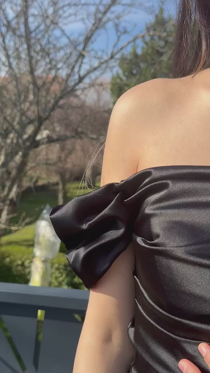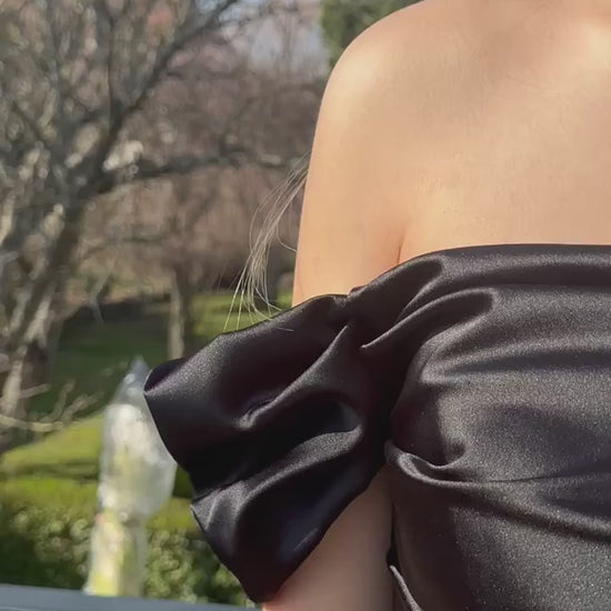 Robe longue satin noire avec traîne – Chic intemporel