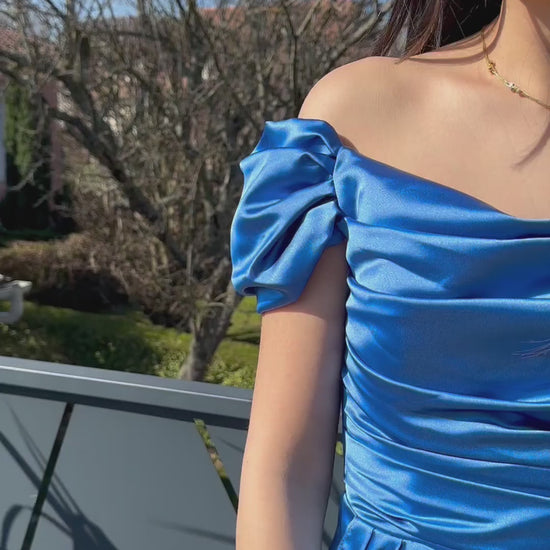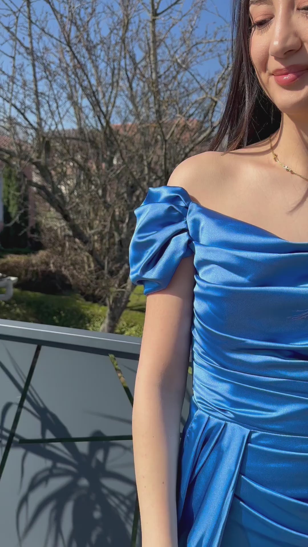 Brillez de mille feux avec cette robe longue en satin bleu électrique, sans manches et dotée d’une traîne élégante. Parfaite pour une soirée inoubliable.