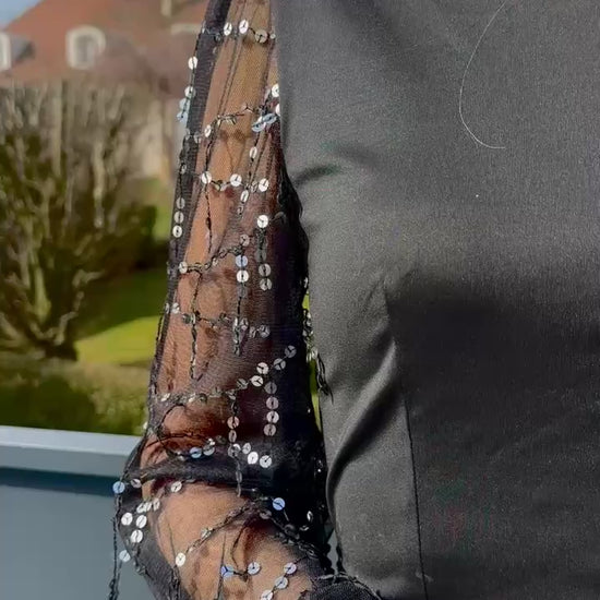 Robe longue noire avec manche à perles.