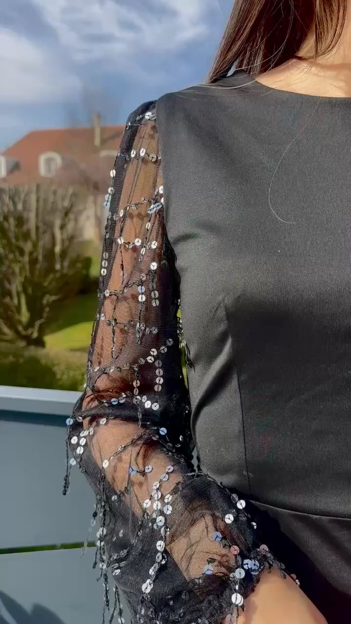 Robe noir longue avec manche à perles