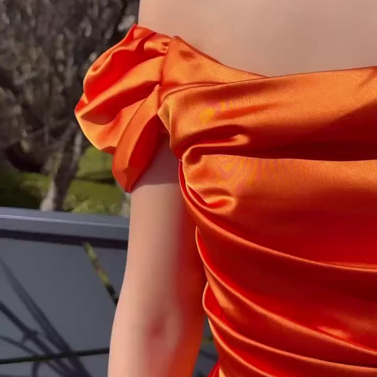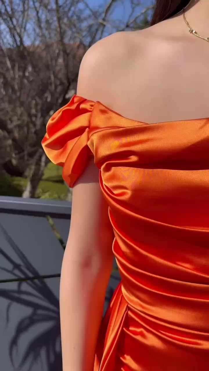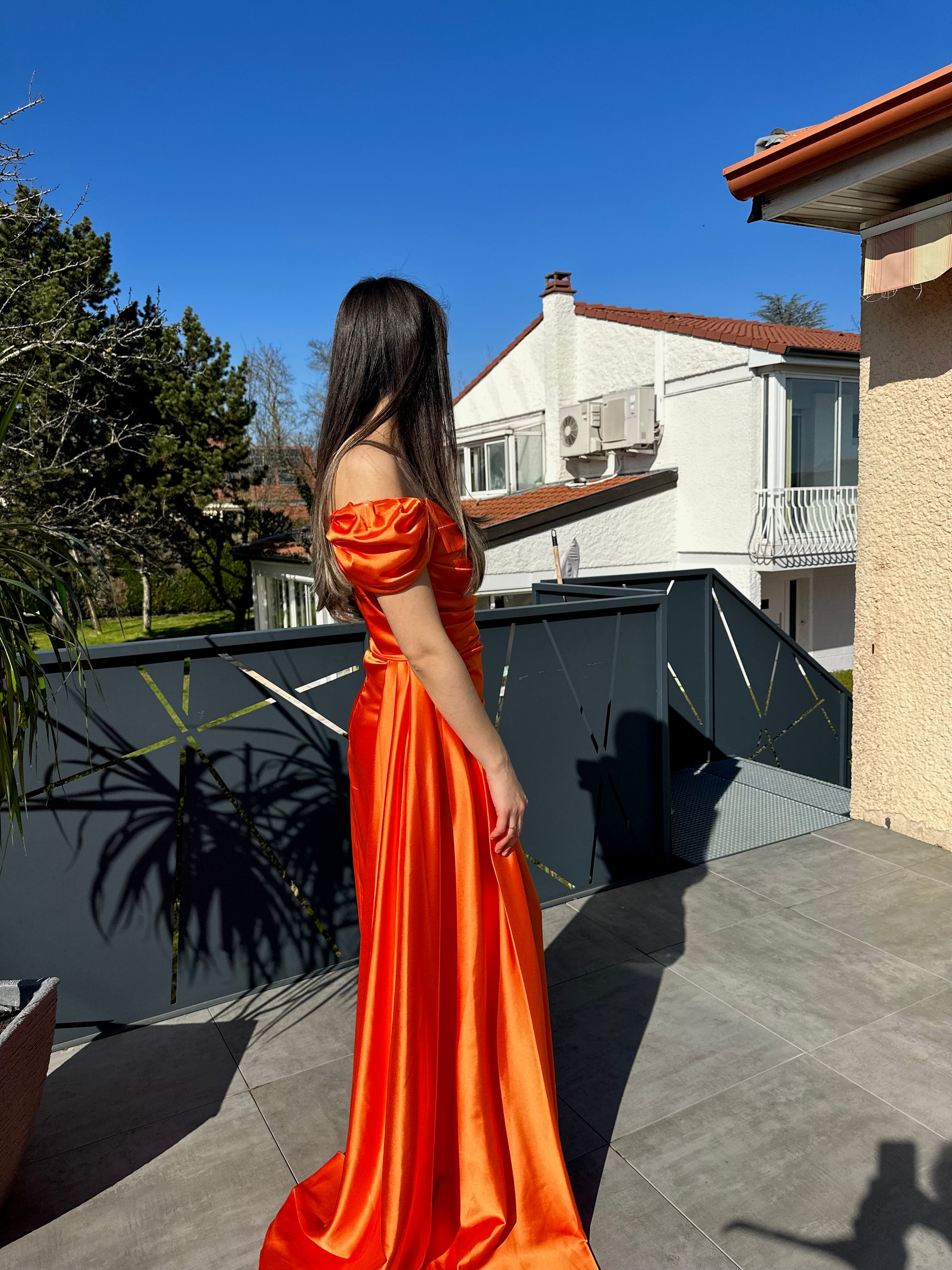 Osez la couleur avec cette robe longue en satin orange, fluide et sans manches, rehaussée d’une traîne sur le côté. Une pièce éclatante et raffinée.