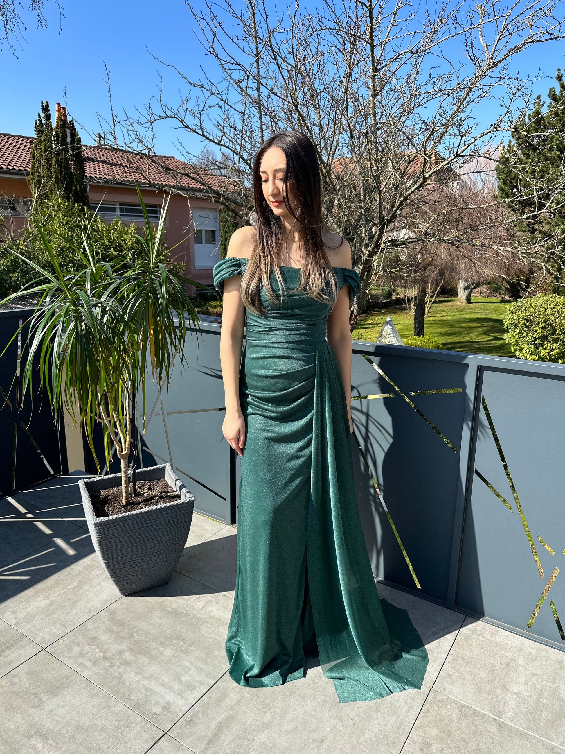 Faites une entrée remarquée avec cette robe verte, ornée d'une traîne brillante sur le côté. Une pièce raffinée qui allie grâce et éclat pour un look inoubliable.